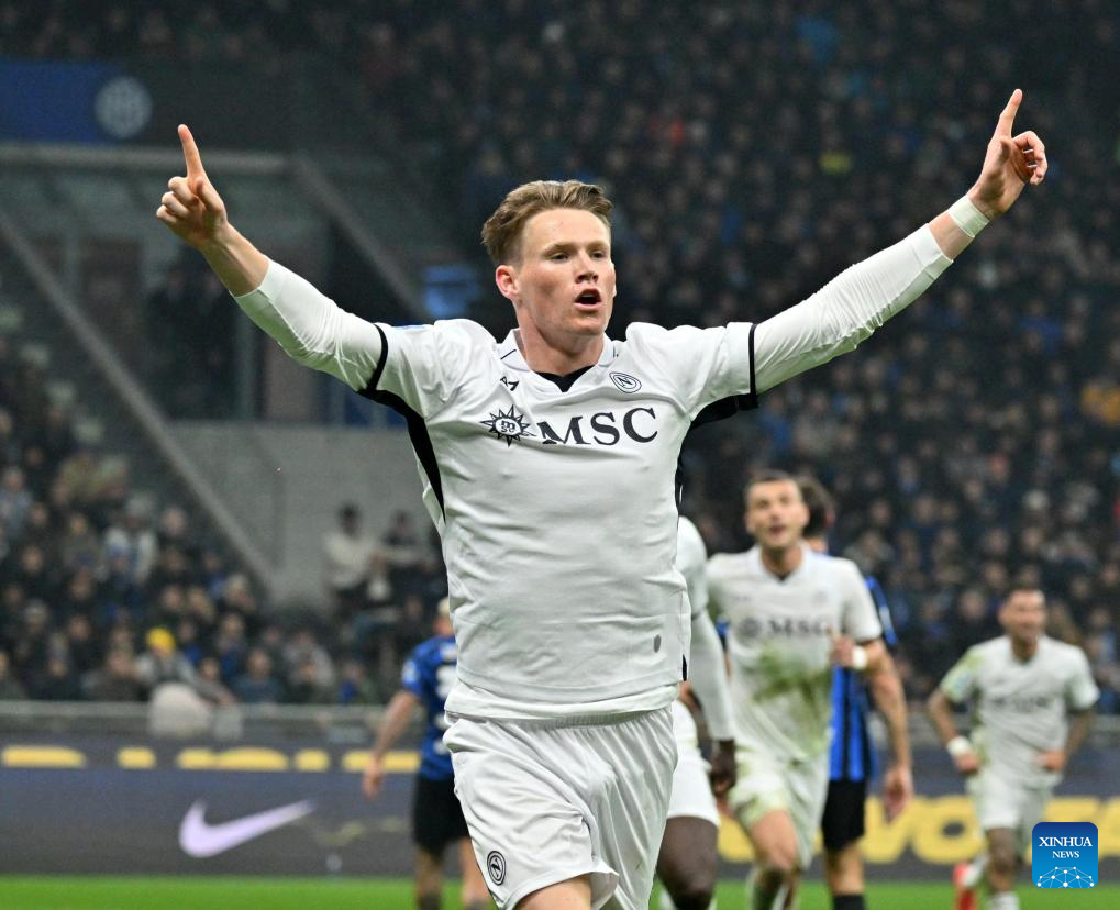 Napoli's Scott McTominay celebrates his goal during a Serie A football match between Inter Milan and Napoli in Milan, Italy, Nov. 10, 2024. (Photo by Alberto Lingria/Xinhua)