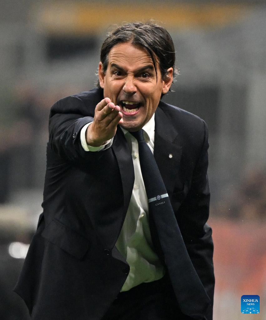 Inter Milan's head coach Simone Inzaghi gestures during a Serie A football match between Inter Milan and Napoli in Milan, Italy, Nov. 10, 2024. (Photo by Alberto Lingria/Xinhua)