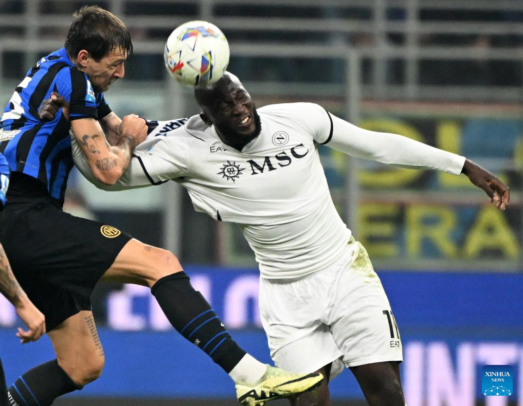 Inter Milan's Francesco Acerbi (L) vies with Napoli's Romelu Lukaku during a Serie A football match between Inter Milan and Napoli in Milan, Italy, Nov. 10, 2024. (Photo by Alberto Lingria/Xinhua)