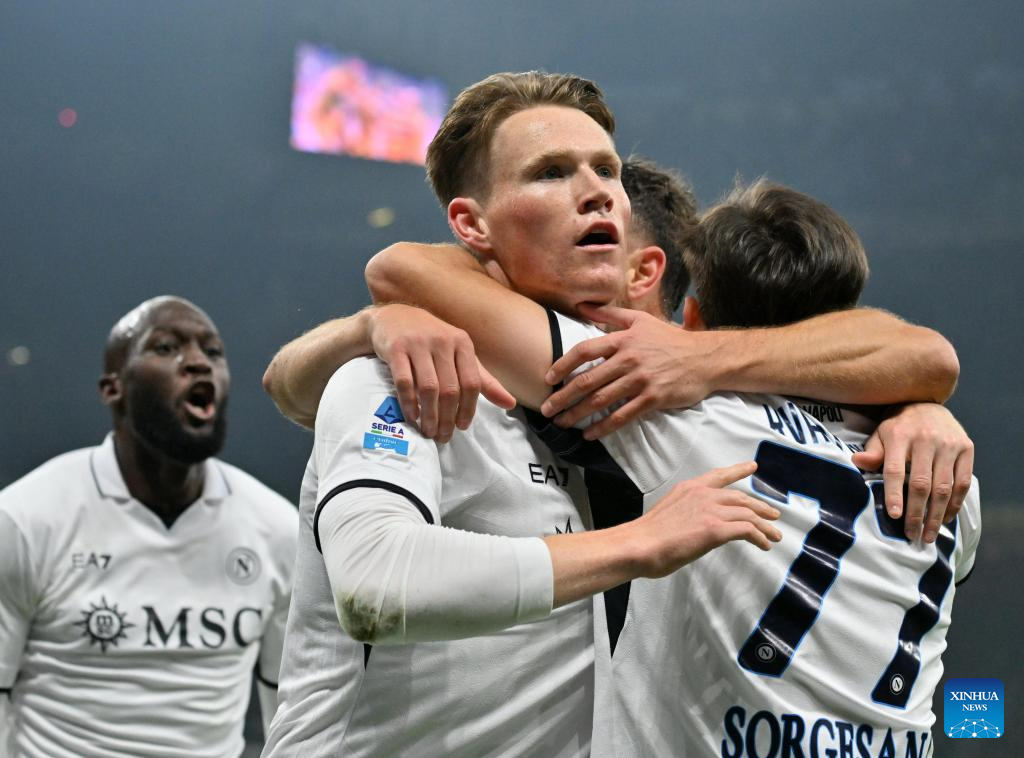 Napoli's Scott McTominay celebrates his goal with teammates during a Serie A football match between Inter Milan and Napoli in Milan, Italy, Nov. 10, 2024. (Photo by Alberto Lingria/Xinhua)