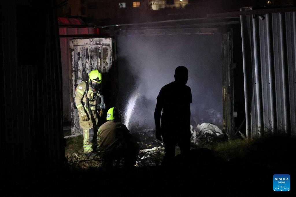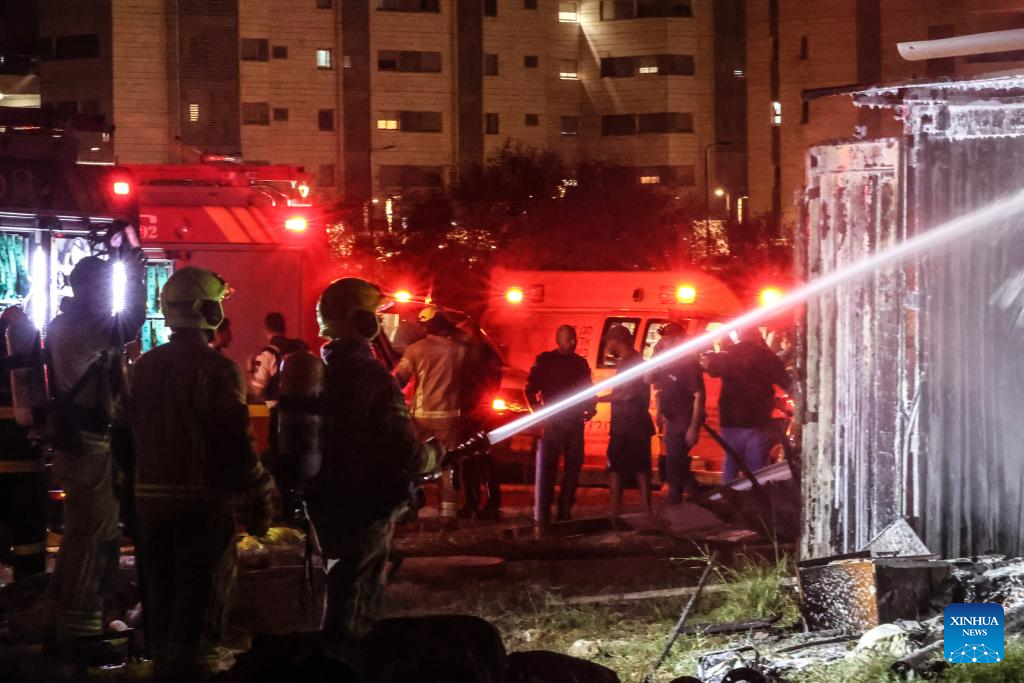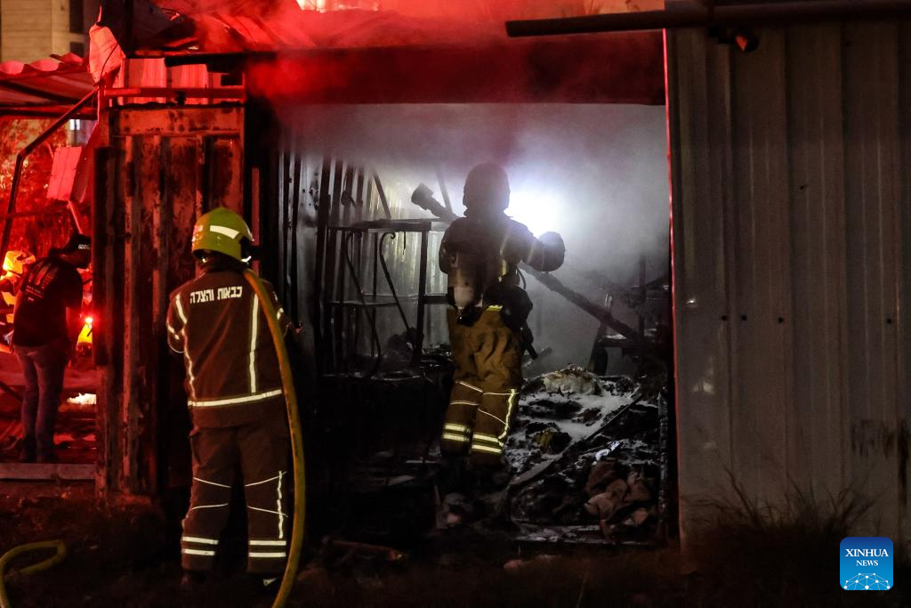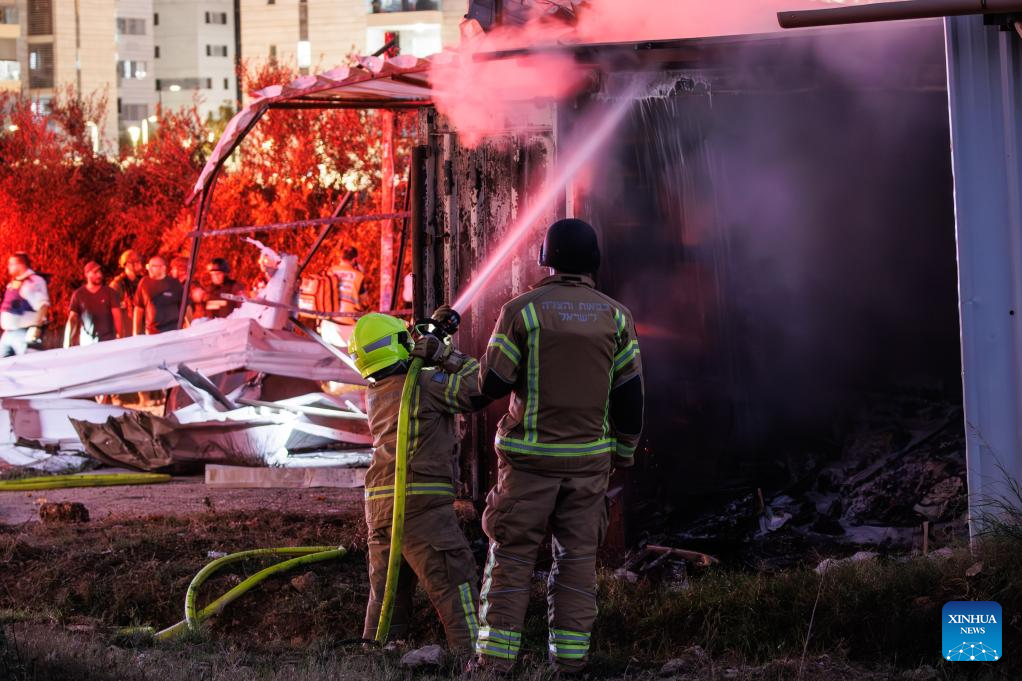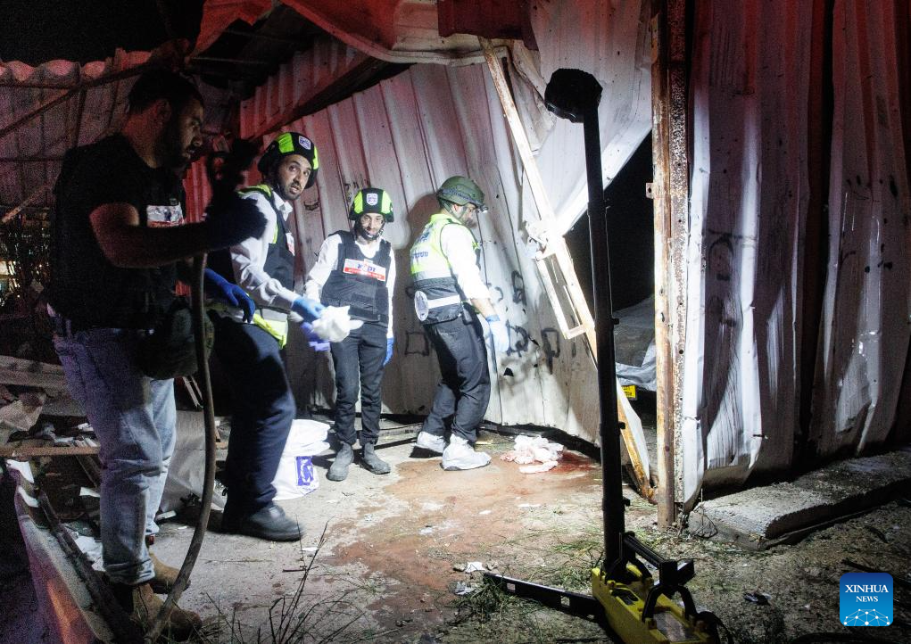 Israeli emergency team members work at the site of a rocket attack from Lebanon, in Nahariya, northern Israel, on Nov. 12, 2024. Two men were killed in Nahariya on Tuesday in a rocket attack from Lebanon, Israeli authorities said. (JINI via Xinhua)