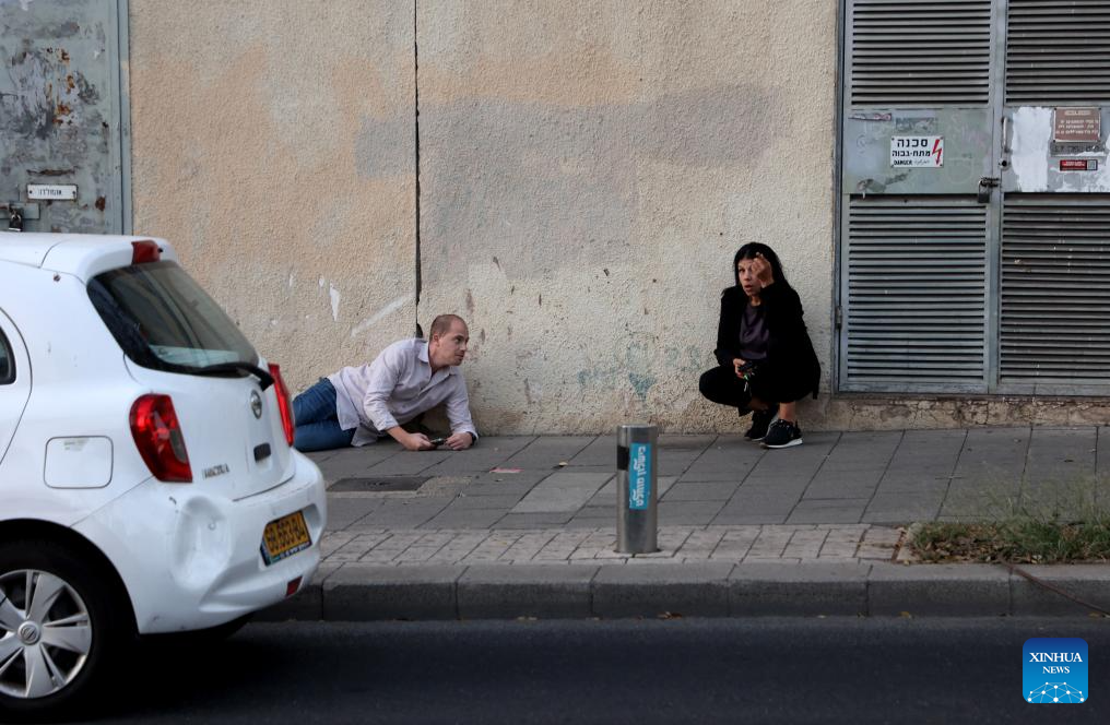 People shelter themselves close to a building as the siren goes off in Tel Aviv, Israel, on Nov. 12, 2024. Two men were killed in Israel's northern city of Nahariya on Tuesday in a rocket attack from Lebanon, Israeli authorities said. According to the Israeli military, Hezbollah forces launched two barrages in the afternoon, the first of around 10 rockets targeting the north that led to the casualties, and the second of three rockets targeting the Tel Aviv area, which was intercepted by the Israeli Air Force. (Photo by Gil Cohen Magen/Xinhua)