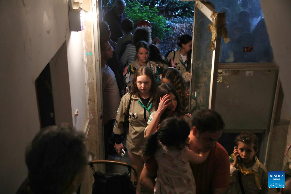 People take cover inside a building as the siren goes off in Tel Aviv, Israel, on Nov. 12, 2024. Two men were killed in Israel's northern city of Nahariya on Tuesday in a rocket attack from Lebanon, Israeli authorities said. According to the Israeli military, Hezbollah forces launched two barrages in the afternoon, the first of around 10 rockets targeting the north that led to the casualties, and the second of three rockets targeting the Tel Aviv area, which was intercepted by the Israeli Air Force. (Gideon Markowicz/JINI via Xinhua)
