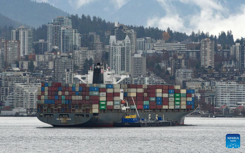 A container ship loaded with stacks of containers is anchored in Vancouver Harbour outside Centennial Container Terminal, British Columbia, Canada, Nov. 12, 2024. Canada's federal government on Tuesday stepped in to end the work stoppages and labor disputes at the country's major ports including the largest two, Vancouver and Montreal. (Photo by Liang Sen/ Xinhua)