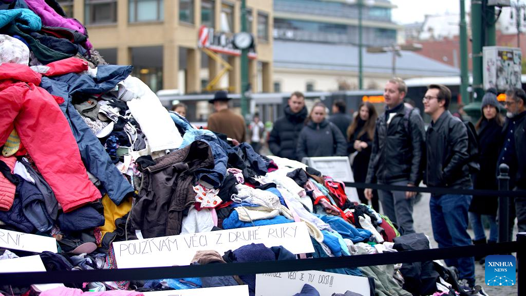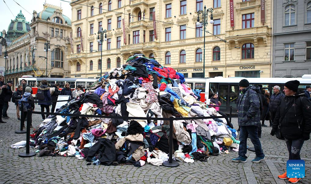 People gather around a pile of clothing created to raise awareness about the issue of textile waste in Prague, the Czech Republic, on Nov. 12, 2024. (Photo by Dana Kesnerova/Xinhua)