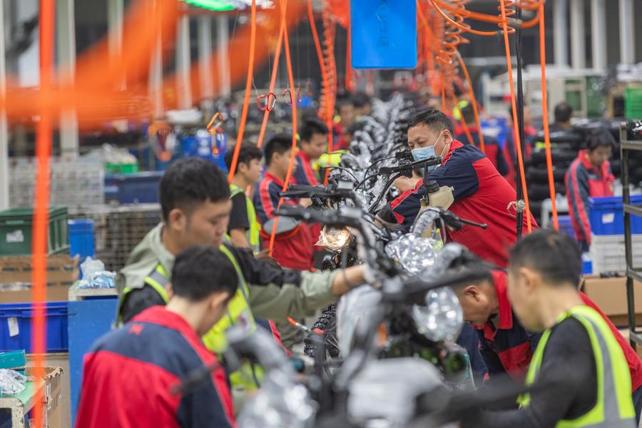Staff members work on an assembly line at Chongqing Shineray Motorcycle Co., Ltd. in Chongqing, southwest China, Nov. 13, 2024. (Xinhua/Huang Wei)