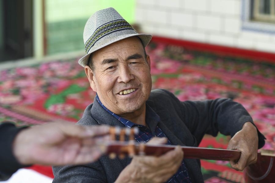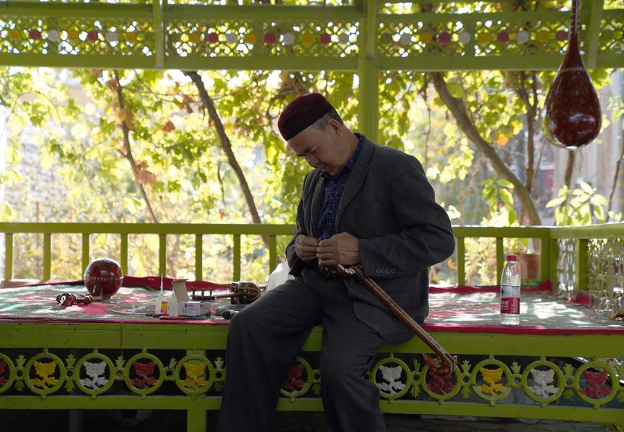 URUMQI, Nov. 14 (Xinhua) -- In a small courtyard dappled with light under a grape arbor, 65-year-old Nurdun Esmayil was making handmade folk musical instruments with his family and apprentices. Although he cannot read music, his keen ears have enabled him to make and play these instruments with precision.