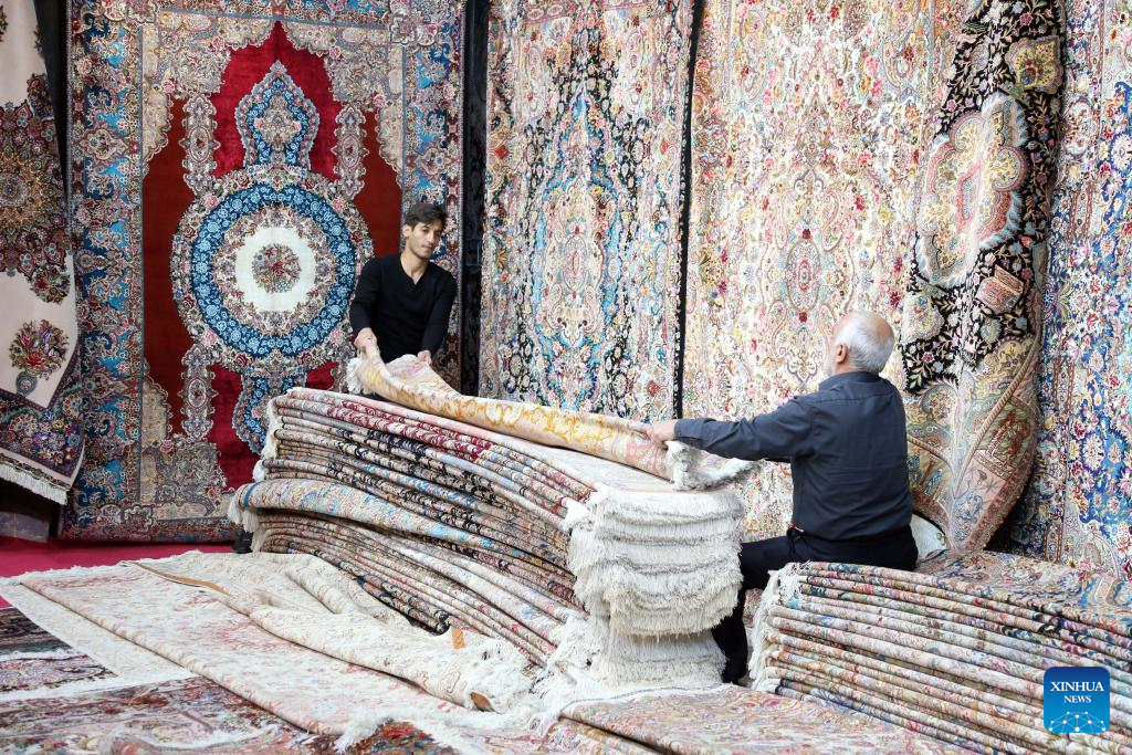 Exhibitors arrange carpets during the 31st Iran International Handmade Carpet Exhibition in Tehran, Iran, Nov. 14, 2024. The five-day event opened here on Wednesday. (Xinhua/Shadati)