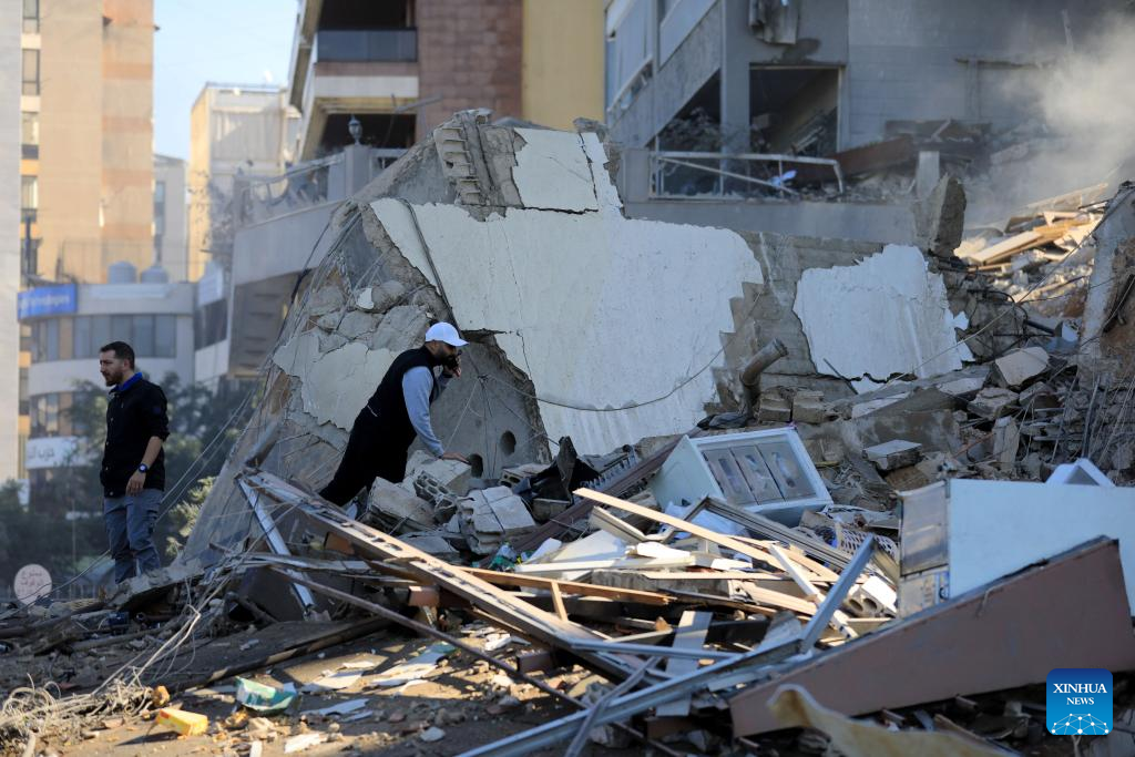 This photo shows the damage caused by Israeli airstrikes in the southern suburb of Beirut, Lebanon, on Nov. 15, 2024. Israeli warplanes raided the Ghobeiry area in Beirut's southern suburbs on Friday morning, shortly after the Israeli army spokesman issued a warning to evacuate several buildings in the area. (Str/Xinhua)