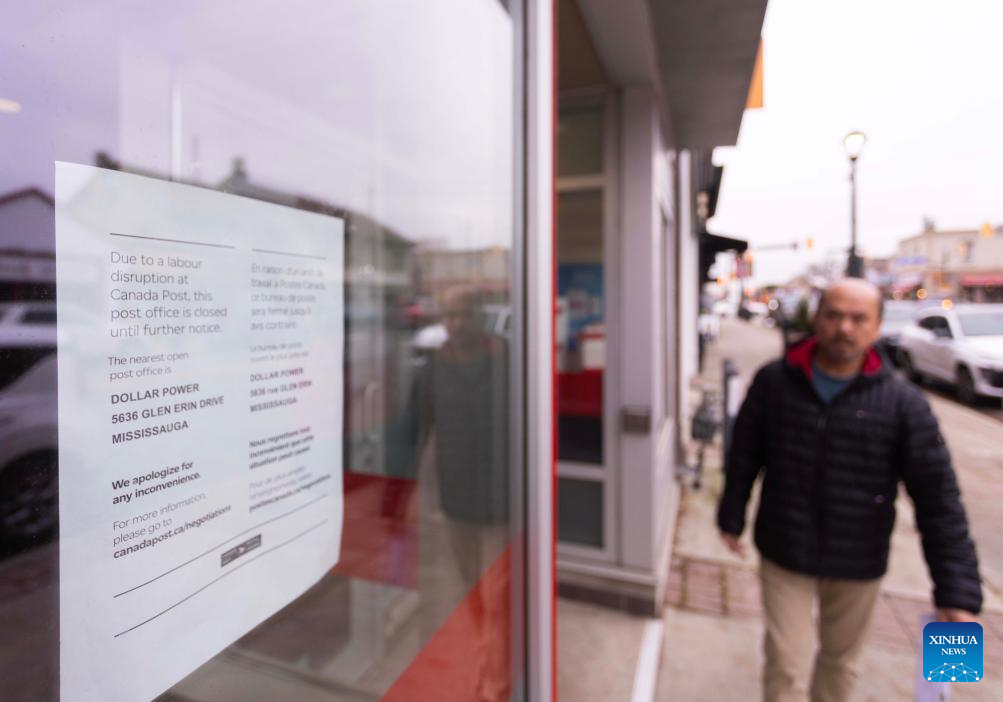 A closure notice is posted on the window of a post office in Mississauga, Ontario, Canada, on Nov. 15, 2024. (Photo by Zou Zheng/Xinhua)