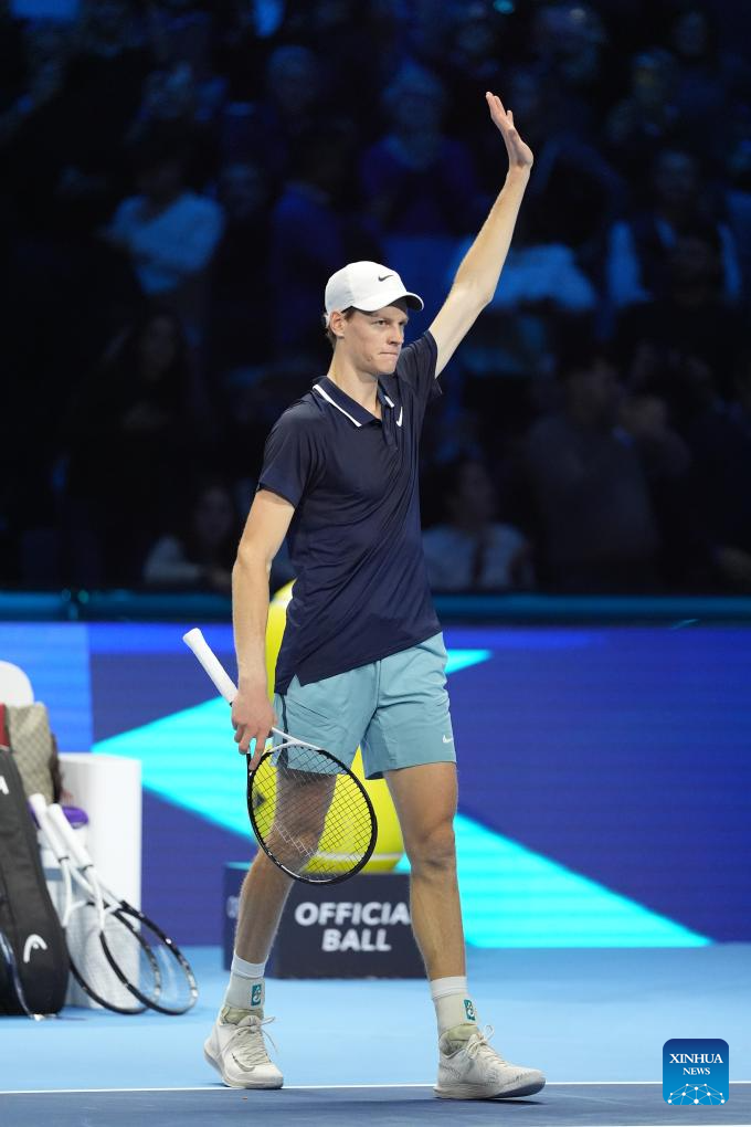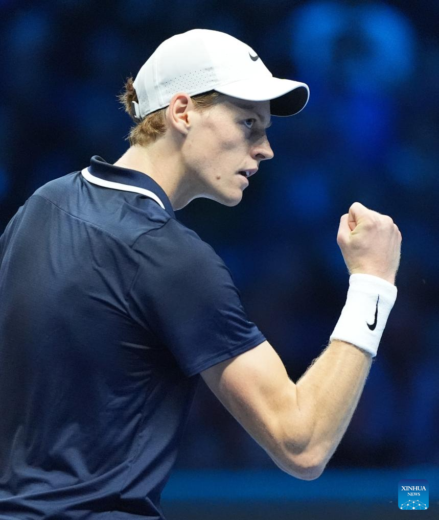 Jannik Sinner of Italy celebrates after the round robin match against Daniil Medvedev of Russia at the Nitto ATP Finals in Turin, Italy, on Nov. 14, 2024. (Xinhua)