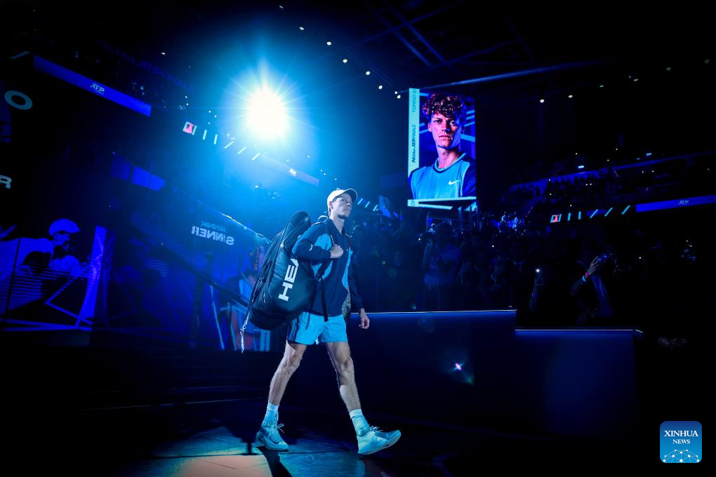 Jannik Sinner of Italy enters the court before the round robin match against Daniil Medvedev of Russia at the Nitto ATP Finals in Turin, Italy, on Nov. 14, 2024. (Xinhua)