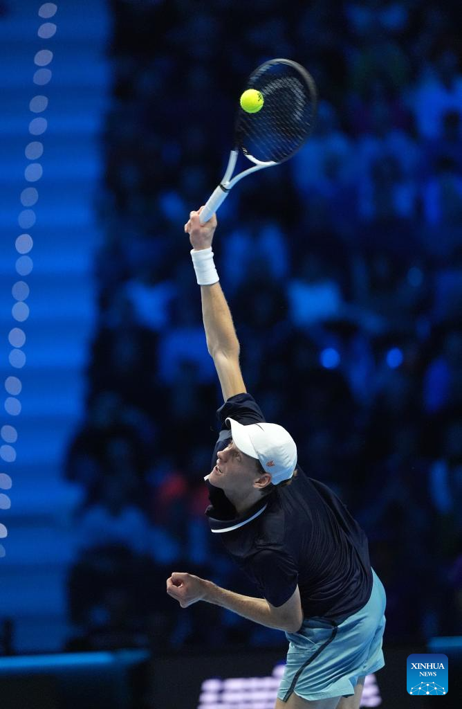 Jannik Sinner of Italy serves during the round robin match against Daniil Medvedev of Russia at the Nitto ATP Finals in Turin, Italy, on Nov. 14, 2024. (Xinhua)