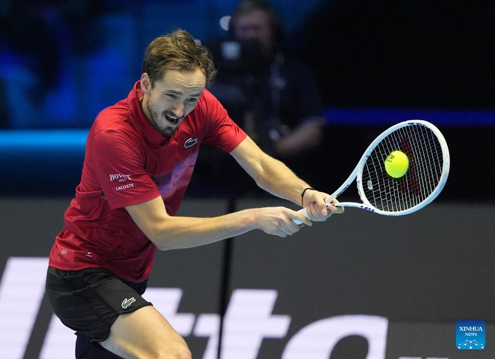 Daniil Medvedev of Russia hits a return during the round robin match against Jannik Sinner of Italy at the Nitto ATP Finals in Turin, Italy, on Nov. 14, 2024. (Xinhua)