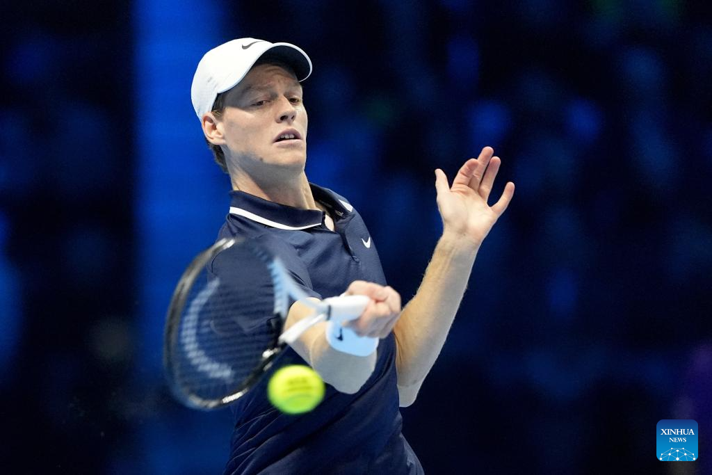 Jannik Sinner of Italy hits a return during the round robin match against Daniil Medvedev of Russia at the Nitto ATP Finals in Turin, Italy, on Nov. 14, 2024. (Xinhua)