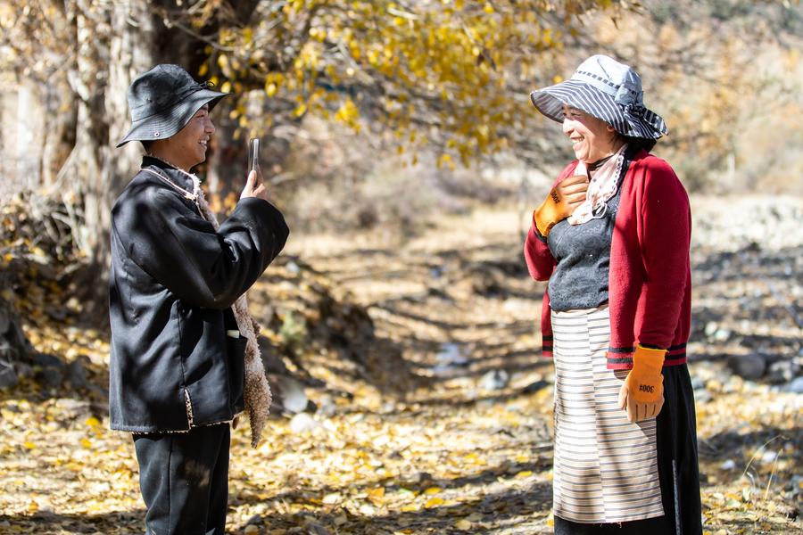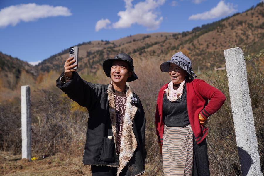 Dawa (L) and his mother record a video in Jiawa Town of Litang County in Garze Tibetan Autonomous Prefecture, southwest China's Sichuan Province, Nov. 3, 2024. Born in 1999, Dawa grew up in Jiawa Town, Litang County. After graduating from college, Dawa returned to his hometown from Chengdu and became a tour guide. He usually records his daily life on the phone and posts it on social media. At the end of 2023, Dawa and his family started e-commerce live-streaming business to promote local products. (Xinhua/Xu Bingjie)