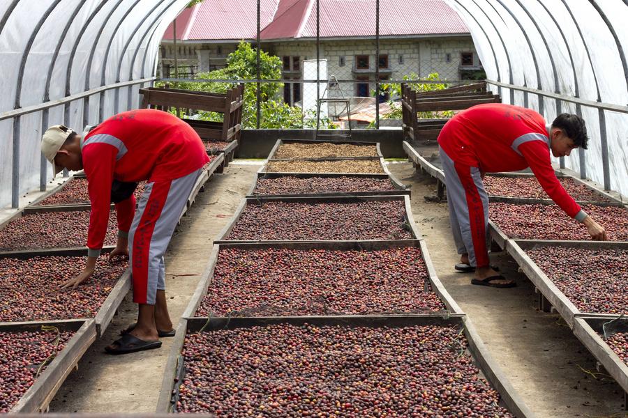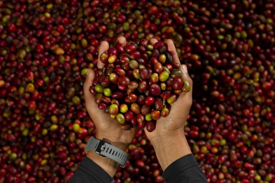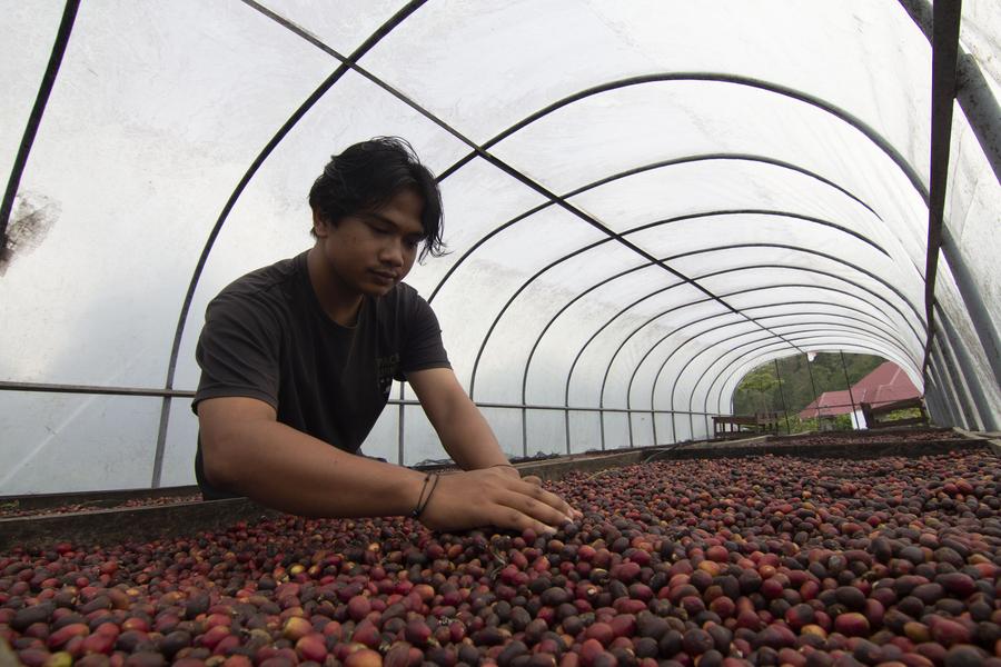 Photo taken on Nov. 15, 2024 shows a worker holds red cherry arabica coffee beans after harvested at Aie Dingin village in Solok Regency, West Java, Indonesia. (Ade Yuandha/Xinhua) Photo taken on Nov. 15, 2024 shows workers are seen during dried procesing of arabica coffee beans at Aie Dingin village in Solok Regency, West Java, Indonesia. (Ade Yuandha/Xinhua)Photo taken on Nov. 15, 2024 shows workers sort arabica coffee beans during dried processing at Aie Dingin village in Solok Regency, West Java, Indonesia. (Ade Yuandha/Xinhua) Photo taken on Nov. 15, 2024 shows a farmer picks red cherry arabica coffee beans at Aie Dingin village in Solok Regency, West Java, Indonesia. (Ade Yuandha/Xinhua)Photo taken on Nov. 15, 2024 shows a worker sorts arabica coffee beans during dried processing at Aie Dingin village in Solok Regency, West Java, Indonesia. (Ade Yuandha/Xinhua)■