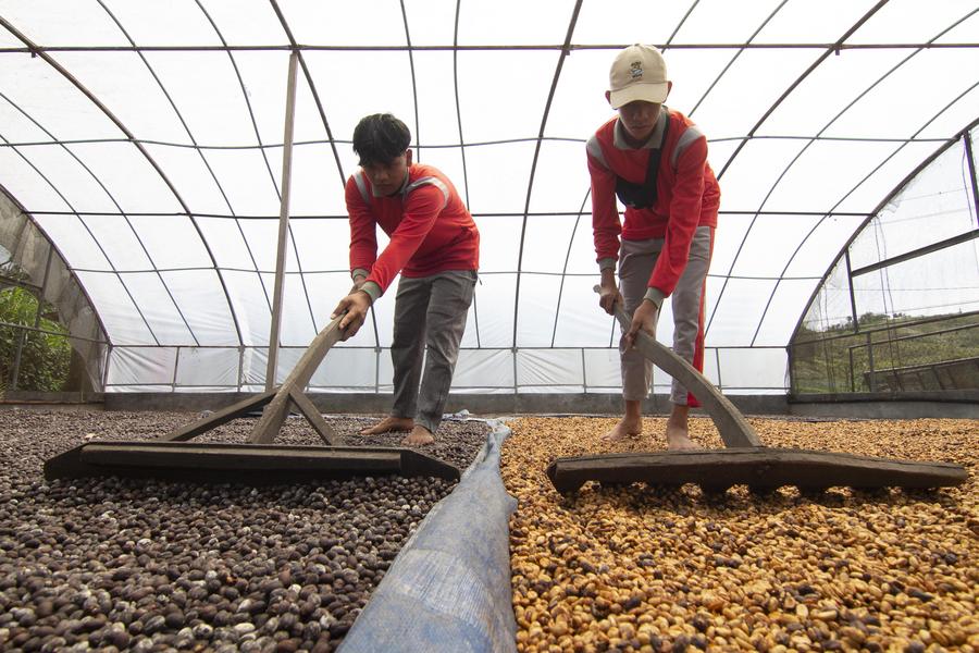 JAKARTA, Nov. 16 (Xinhua) -- Indonesian workers harvested Arabica coffee beans in West Java. As the fourth largest coffee-producing country in the world, Indonesia produces around 642,000 metric tons of coffee and contributes 6 percent of the world's coffee production.