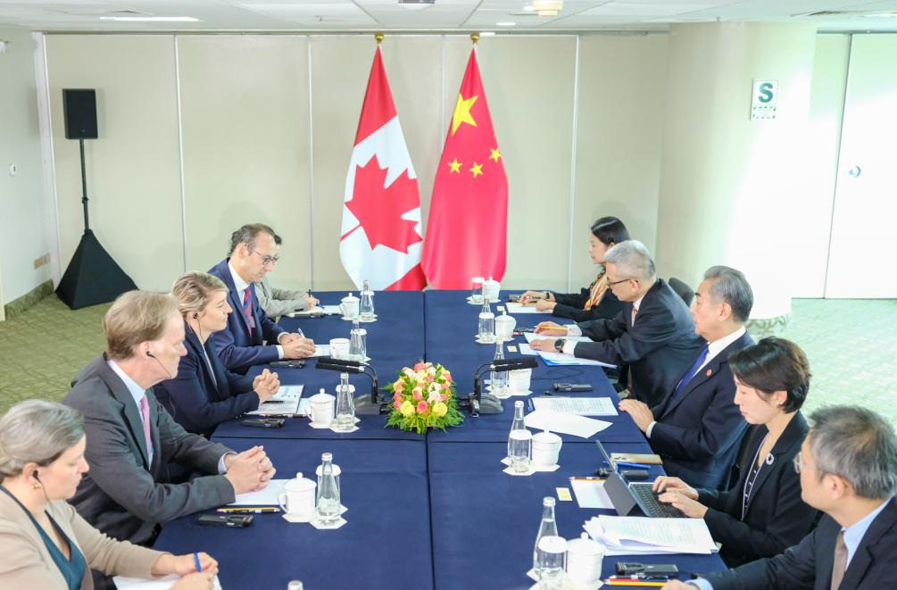 Chinese Foreign Minister Wang Yi, also a member of the Political Bureau of the Communist Party of China Central Committee, meets with Canadian Foreign Minister Melanie Joly in Lima, Peru, Nov. 15, 2024. (Xinhua/Ding Lin)