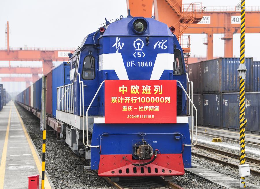 A Long March-7 Y9 carrier rocket carrying cargo spacecraft Tianzhou-8 blasts off from the Wenchang Spacecraft Launch Site in south China's Hainan Province, Nov. 15, 2024. China launched the cargo craft Tianzhou-8 on Friday night to deliver supplies for its orbiting Tiangong space station, according to the China Manned Space Agency. (Xinhua/Yang Guanyu)The 100,000th China-Europe freight train, coded X8083, waits for departing at the Tuanjiecun Station in Chongqing, southwest China, Nov. 15, 2024. The 100,000th China-Europe freight train departed from southwest China's Chongqing Municipality on Friday morning, a significant milestone in the development of the service that facilitates economic and trade exchanges between China and Europe. (Xinhua/Wang Quanchao)An aerial drone photo taken on Oct. 10, 2023 shows the view of Shibadong Village of Xiangxi Tujia and Miao Autonomous Prefecture, central China's Hunan Province. Seven villages in China have been honored as Best Tourism Villages by the United Nations World Tourism Organization (UN Tourism) in its 2024 selection, according to the Ministry of Culture and Tourism. (Xinhua/Chen Sihan)Gyume Namkha paints thangka at his workshop in Maisu Town of Dege County in Garze Tibetan Autonomous Prefecture, southwest China's Sichuan Province, Nov. 3, 2024. Post-90s thangka artist Gyume Namkha began to learn thangka painting from his father at the age of 6. Through inheritance and innovation, he added modern elements to form his own unique style and promote thangka culture. Today, there are 41 painters and students in the thangka workshop opened by Gyume Namkha. (Xinhua/Wang Xi)A tourist practices yoga at a homestay at Huangguoshu Scenic Area in Anshun City, southwest China's Guizhou Province, Nov. 14, 2024. (Xinhua/Yang Wenbin)Tundra swans fly over Chongming Dongtan National Nature Reserve at sunset in east China's Shanghai, Nov. 12, 2024. (Xinhua/Li Bo)A container is lifted at Chancay Port in Peru, on Nov. 14, 2024. The inauguration ceremony of Chancay Port was held on Nov. 14 local time. Chancay Port is not only an important project under Belt and Road cooperation, but also the first smart and green port in South America. The first phase of the project, when completed, will reduce the sea shipping time from Peru to China to 23 days, thus cutting logistics costs by at least 20 percent. (Xinhua/Li Mengxin)A person takes a photo of a full moon in Lhokseumawe, Aceh Province, Indonesia, on Nov. 15, 2024. (Photo by Fachrul Reza/Xinhua)Zhang Yuning (R) of China celebrates scoring with teammates during the 2026 FIFA World Cup Asian Qualifiers Group C match between China and Bahrain in Riffa, Bahrain, Nov. 14, 2024. (Xinhua/Wang Haizhou)■