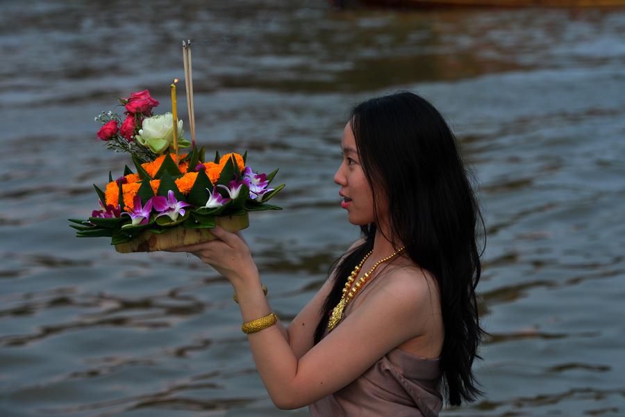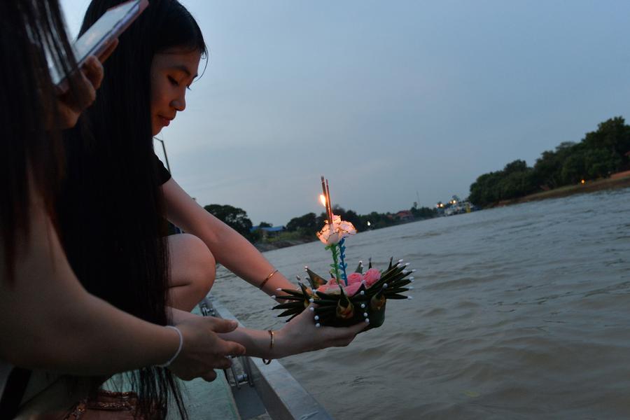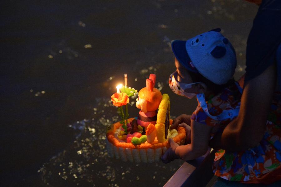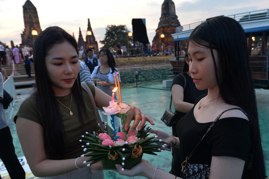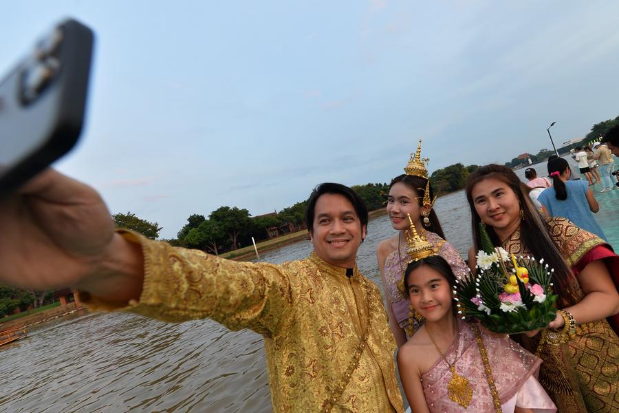 A child releases a water lantern during the Loy Krathong Festival by the Chao Phraya River in Ayutthaya, Thailand, Nov. 15, 2024. (Xinhua/Rachen Sageamsak)People take selfies with a water lantern during the Loy Krathong Festival by the Chao Phraya River in Ayutthaya, Thailand, Nov. 15, 2024. (Xinhua/Rachen Sageamsak)Women pose with a water lantern near Chao Phraya River in Ayutthaya, Thailand, Nov. 15, 2024, during the annual Loy Krathong festival. (Xinhua/Rachen Sageamsak)A woman in traditional Thai costume poses with a water lantern near Chao Phraya River in Ayutthaya, Thailand, Nov. 15, 2024, during the annual Loy Krathong festival. (Xinhua/Rachen Sageamsak)A woman sets afloat a water lantern on Chao Phraya River in Ayutthaya, Thailand, Nov. 15, 2024, during the annual Loy Krathong festival. (Xinhua/Rachen Sageamsak)■