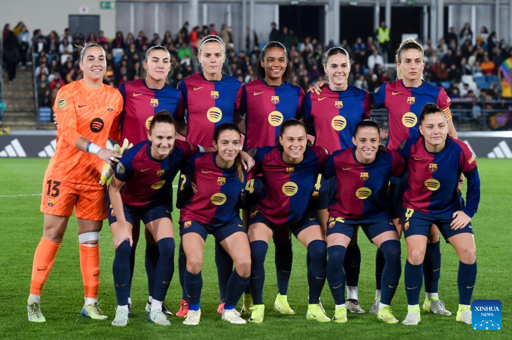 FC Barcelona's players line up before the La Liga F football match between Real Madrid and FC Barcelona at Alfredo Di Stefano stadium in Madrid, Spain, Nov. 16, 2024. (Photo by Gustavo Valiente/Xinhua)