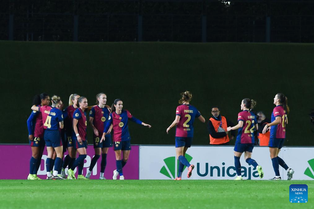 FC Barcelona's players celebrate a goal during the La Liga F football match between Real Madrid and FC Barcelona at Alfredo Di Stefano stadium in Madrid, Spain, Nov. 16, 2024. (Photo by Gustavo Valiente/Xinhua)