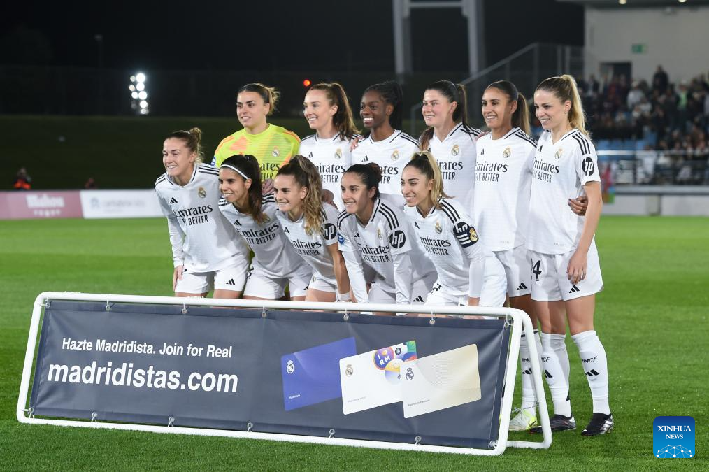 Real Madrid's players line up before the La Liga F football match between Real Madrid and FC Barcelona at Alfredo Di Stefano stadium in Madrid, Spain, Nov. 16, 2024. (Photo by Gustavo Valiente/Xinhua)