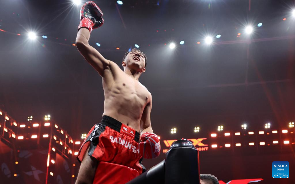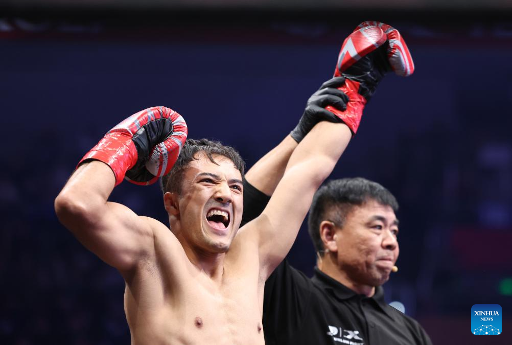 Saliman Aobulihairi of China celebrates after winning the kickboxing 61kg division competition against Yodkitti T.Thepsuthin of Thailand at the IBA Kunlun Fight in Beijing, China, Nov. 16, 2024. (Xinhua/Zhang Chen)