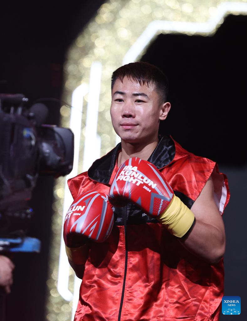 Wang Lequan of China reacts ahead of the men's boxing 63.5kg division quarterfinal match against Bakhodur Usmonov of Tajikistan at the IBA Kunlun Fight in Beijing, China, Nov. 16, 2024. (Xinhua/Zhang Chen)