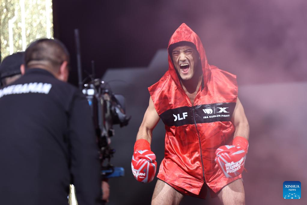 Saliman Aobulihairi of China reacts ahead of the kickboxing 61kg division competition against Yodkitti T.Thepsuthin of Thailand at the IBA Kunlun Fight in Beijing, China, Nov. 16, 2024. (Xinhua/Zhang Chen)