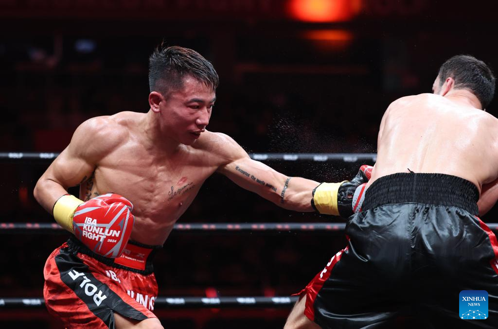 Wang Lequan (L) of China competes with Bakhodur Usmonov of Tajikistan during the men's boxing 63.5kg division quarterfinal match at the IBA Kunlun Fight in Beijing, China, Nov. 16, 2024. (Xinhua/Zhang Chen)