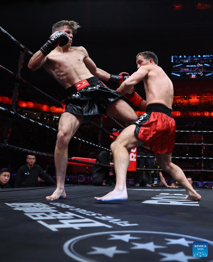 Renato Goman (L) of Hungary competes with Stanislav Kazantsev of Ukraine during the kickboxing 70kg division competition at the IBA Kunlun Fight in Beijing, China, Nov. 16, 2024. (Xinhua/Zhang Chen)