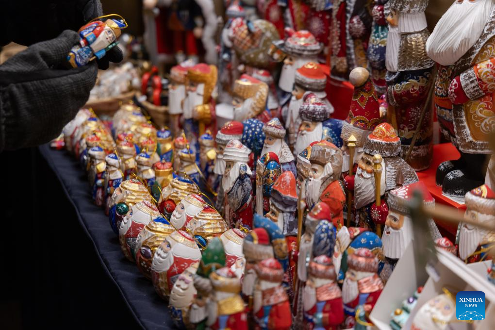 People choose Christmas products at a Christmas market in downtown Budapest, Hungary on Nov. 15, 2024. (Photo by Attila Volgyi/Xinhua)