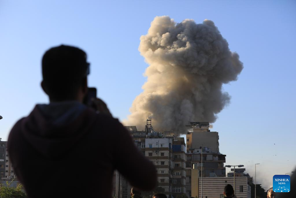 This photo shows the smoke caused by Israeli airstrikes in the southern suburb of Beirut, Lebanon, on Nov. 15, 2024. Israeli warplanes raided the Ghobeiry area in Beirut's southern suburbs on Friday morning, shortly after the Israeli army spokesman issued a warning to evacuate several buildings in the area. (Str/Xinhua)