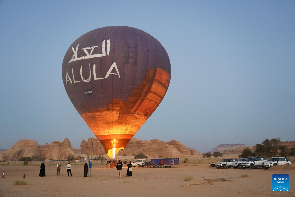 Tourists are ready to ride in a hot air balloon in AlUla, Saudi Arabia, Nov. 16, 2024. Themed "Hegra Sunrise Sky Tour," a hot air balloon event took place on Saturday at Hegra, a UNESCO World Heritage Site in AlUla. (Xinhua/Luo Chen)