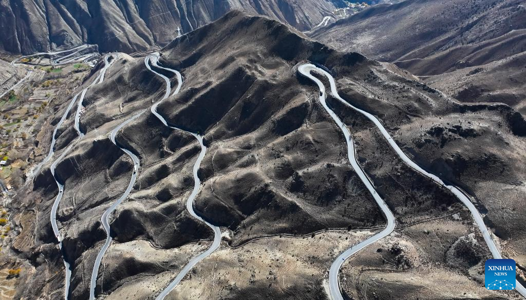 An aerial drone photo taken on Nov. 16, 2024 shows part of Nujiang River zigzag road on the Sichuan-Xizang highway in Baxoi County, southwest China's Xizang Autonomous Region. (Xinhua/Kelsang Namgyai)
