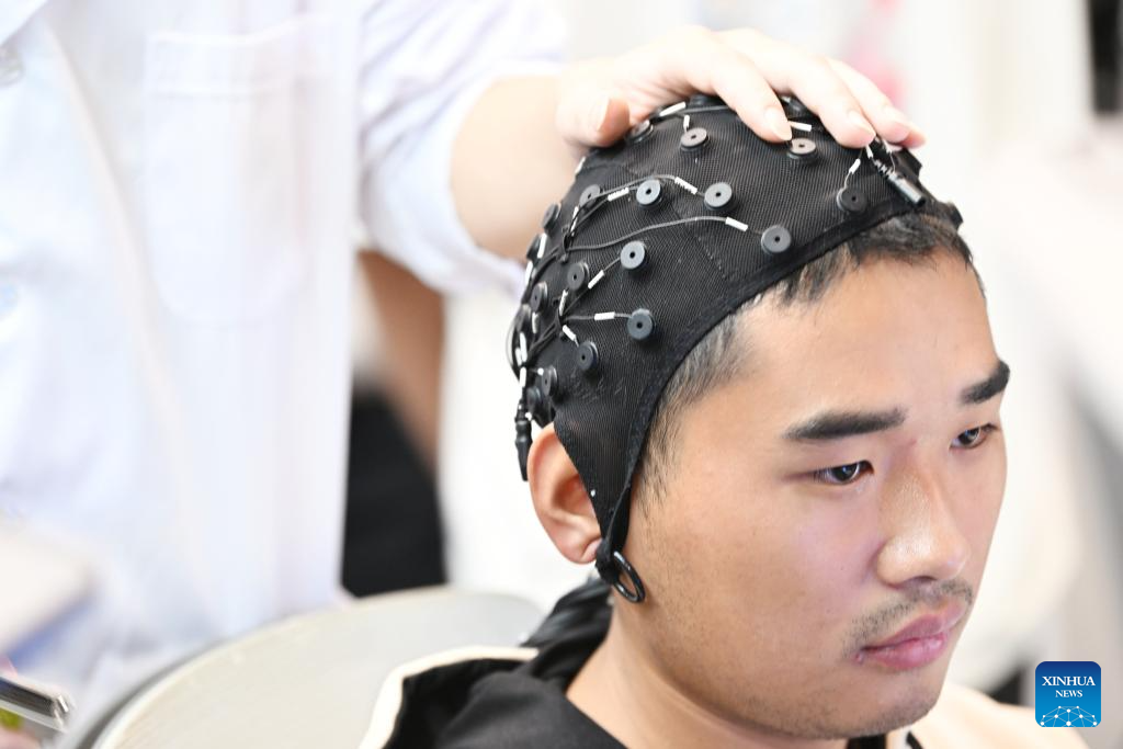 An undergraduate puts on an elastic electroencephalogram cap at a laboratory in Tianjin University in Tianjin, north China, Nov. 15, 2024. Tianjin University enrolled the first batch of freshmen majored in brain-machine interface (BMI), with interdisciplinary courses ranging from the basic theory of brain-machine interaction to device system development, transformation and application. (Xinhua/Li Ran)