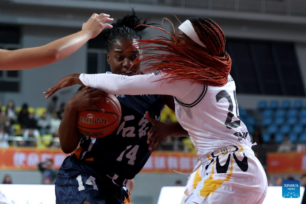 Trinity Essence Baptiste (L) of Team Shijiazhuang competes during a match between Team Shijiazhuang and Team Dongguan at the 2024-2025 season Women's Chinese Basketball Association (WCBA) league in Shijiazhuang, north China's Hebei Province, Nov. 16, 2024. (Photo by Liang Zidong/Xinhua)