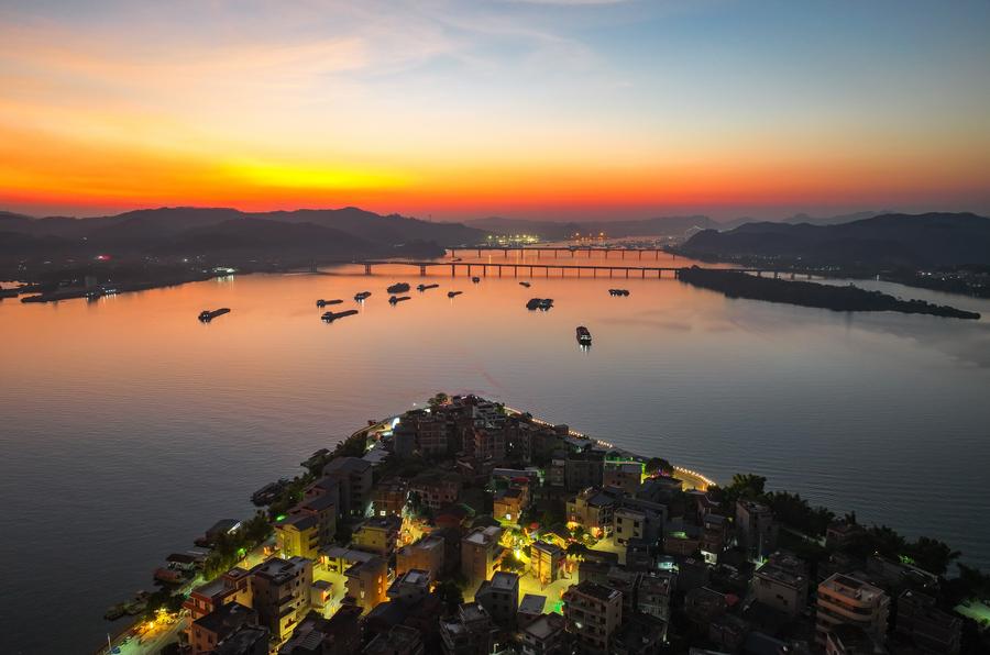 An aerial drone photo taken on Nov. 13, 2024 shows the scenery at sunset in Sizhou Village in Changzhou District of Wuzhou City, south China's Guangxi Zhuang Autonomous Region. (Xinhua/Huang Xiaobang)