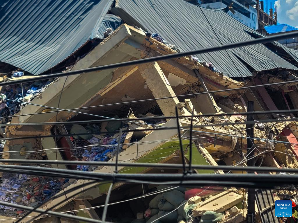 This photo shows a collapsed building in the Kariakoo suburb of Dar es Salaam, Tanzania, on Nov. 16, 2024. Tanzanian Prime Minister Kassim Majaliwa announced on Saturday that one person was killed and 28 others were injured when a four-story building collapsed in the Kariakoo suburb of Dar es Salaam, the country's port city. (Str/Xinhua)