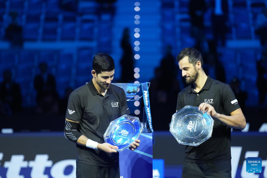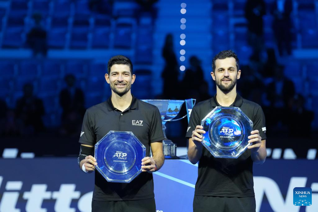 Runners-up Marcelo Arevalo (L)/Mate Pavic pose with their trophies during the awarding ceremony after the men's doubles final match between Kevin Krawietz/Tim Puetz of Germany and Marcelo Arevalo(El Salvador)/Mate Pavic(Croatia) at the Nitto ATP Finals in Turin, Italy, on Nov. 17, 2024. (Xinhua/Li Jing)