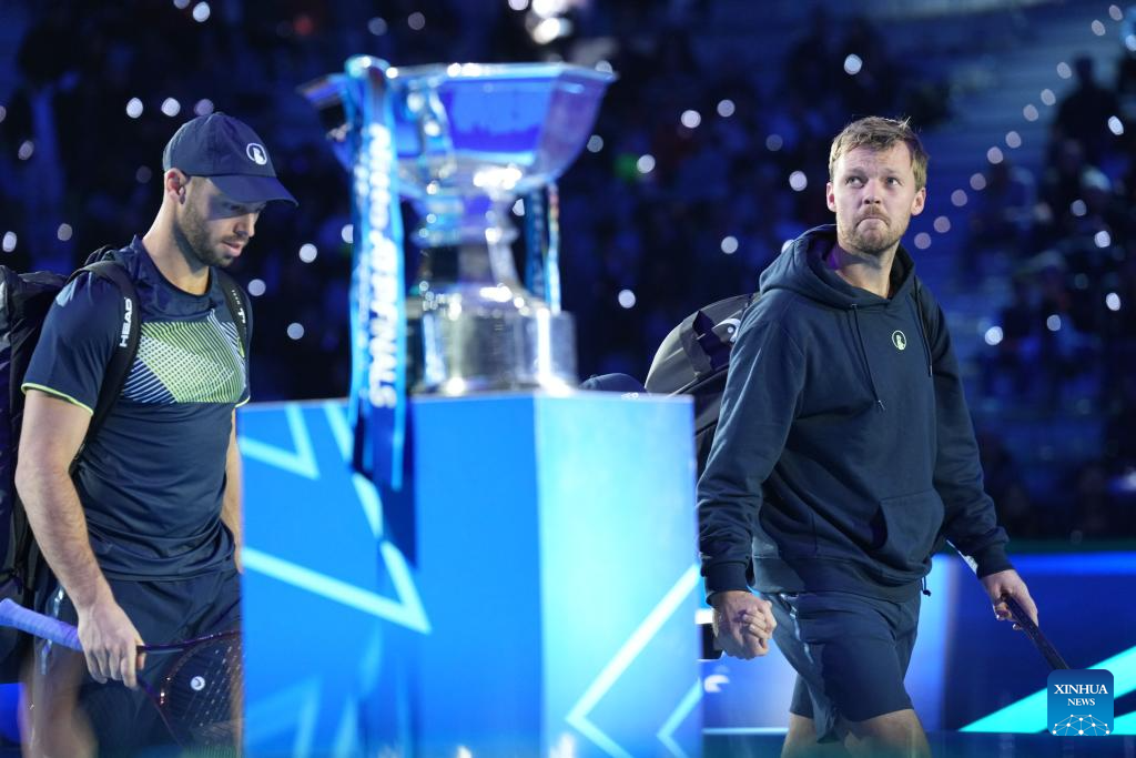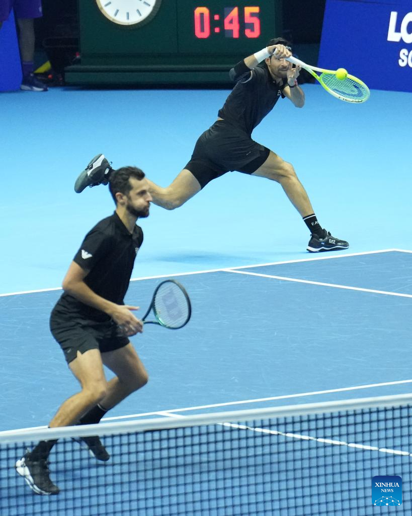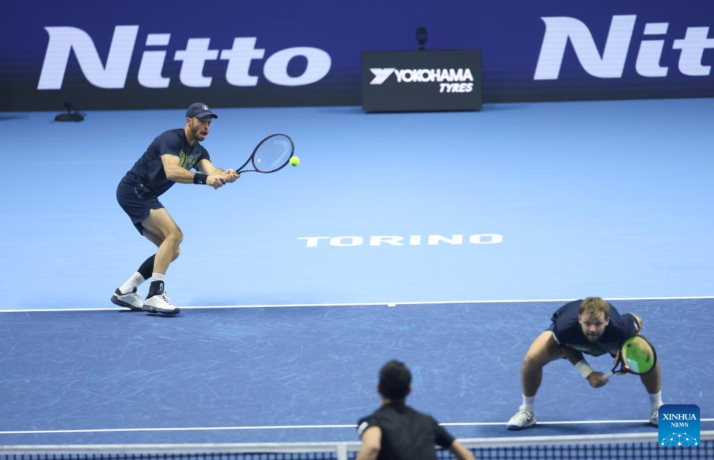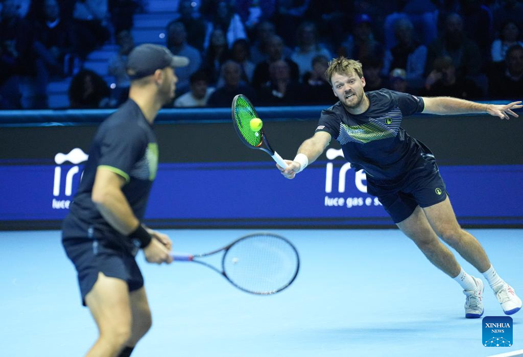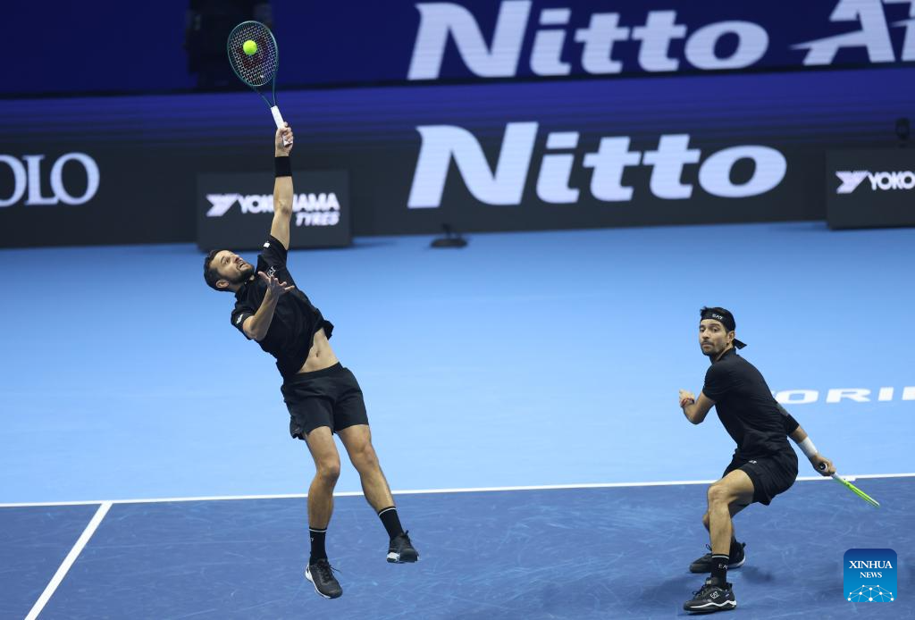 Kevin Krawietz (R)/Tim Puetz compete during the men's doubles final match between Kevin Krawietz/Tim Puetz of Germany and Marcelo Arevalo(El Salvador)/Mate Pavic(Croatia) at the Nitto ATP Finals in Turin, Italy, on Nov. 17, 2024. (Xinhua/Li Jing)