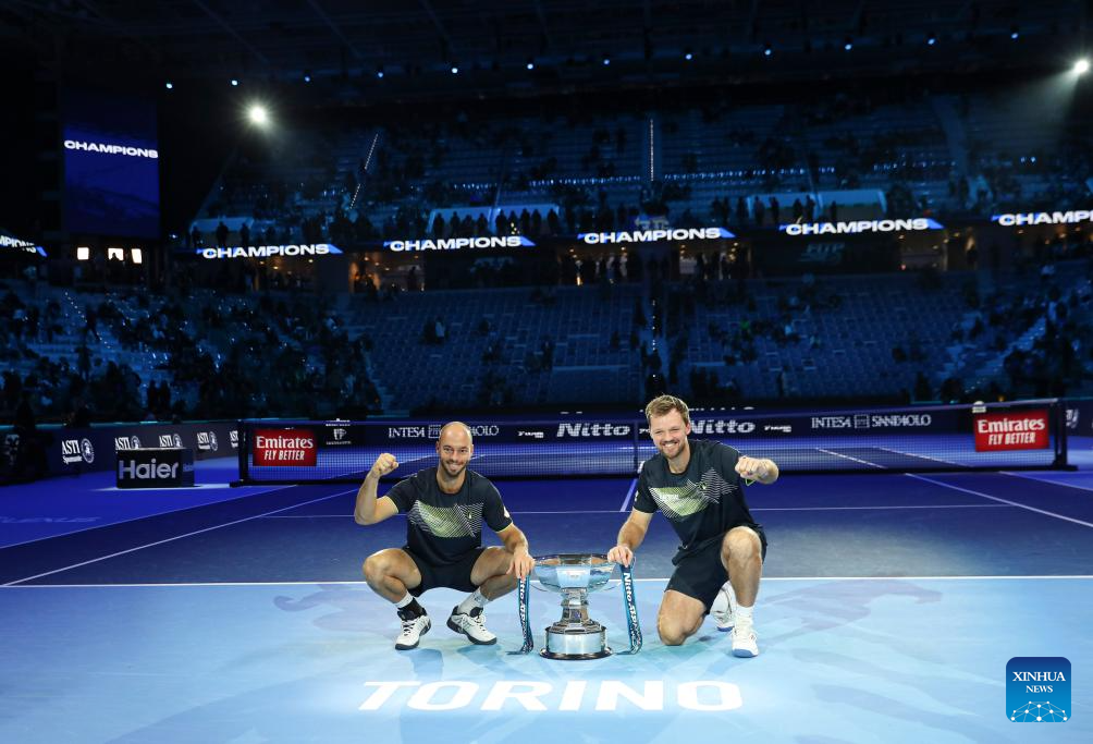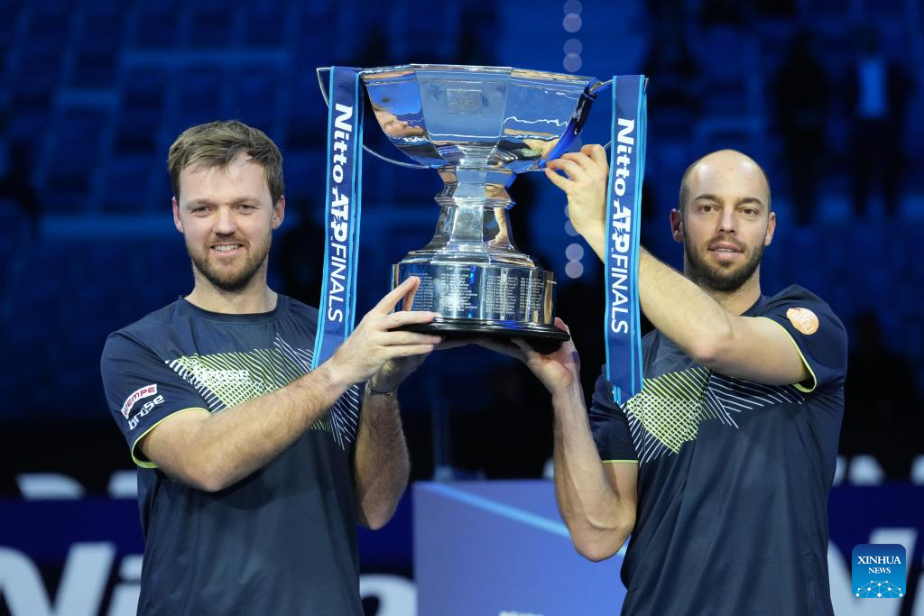 Winners Kevin Krawietz (R)/Tim Puetz of Germany pose with the trophy after winning the men's doubles final match between Kevin Krawietz/Tim Puetz of Germany and Marcelo Arevalo(El Salvador)/Mate Pavic(Croatia) at the Nitto ATP Finals in Turin, Italy, on Nov. 17, 2024. (Xinhua/Li Jing)