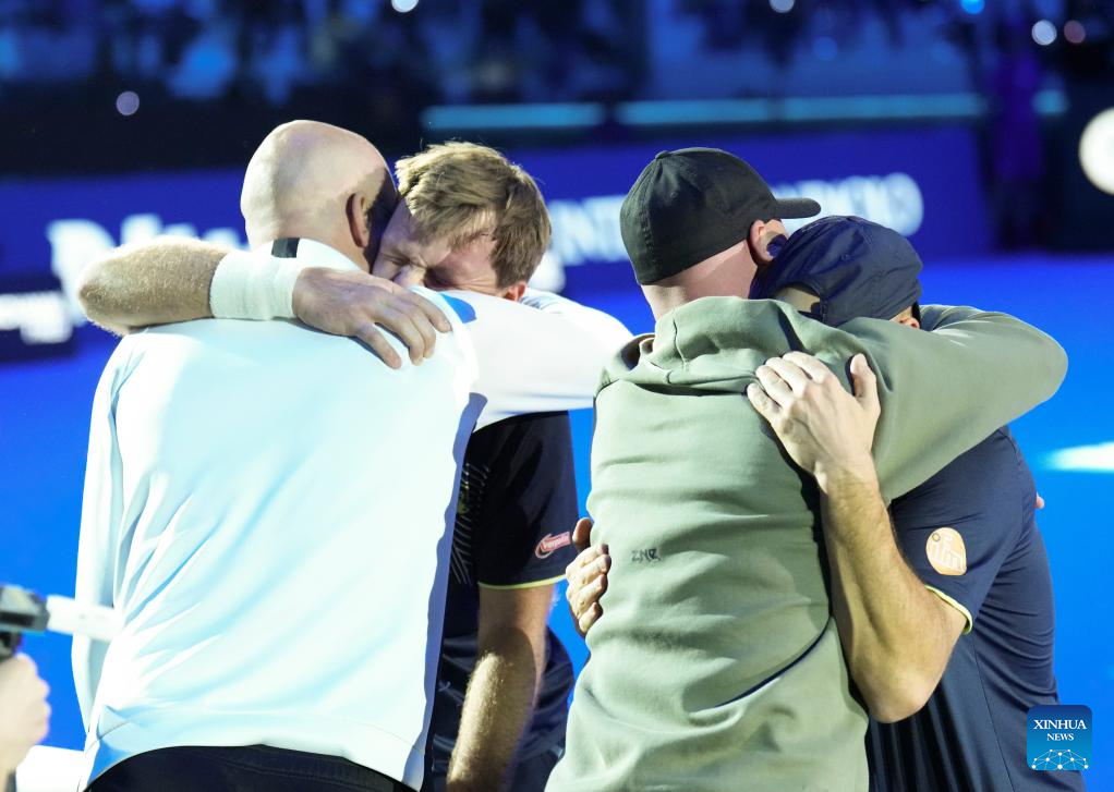 Kevin Krawietz (2nd L)/Tim Puetz (1st R) celebrate with their team members after winning the men's doubles final match between Kevin Krawietz/Tim Puetz of Germany and Marcelo Arevalo(El Salvador)/Mate Pavic(Croatia) at the Nitto ATP Finals in Turin, Italy, on Nov. 17, 2024. (Xinhua/Li Jing)