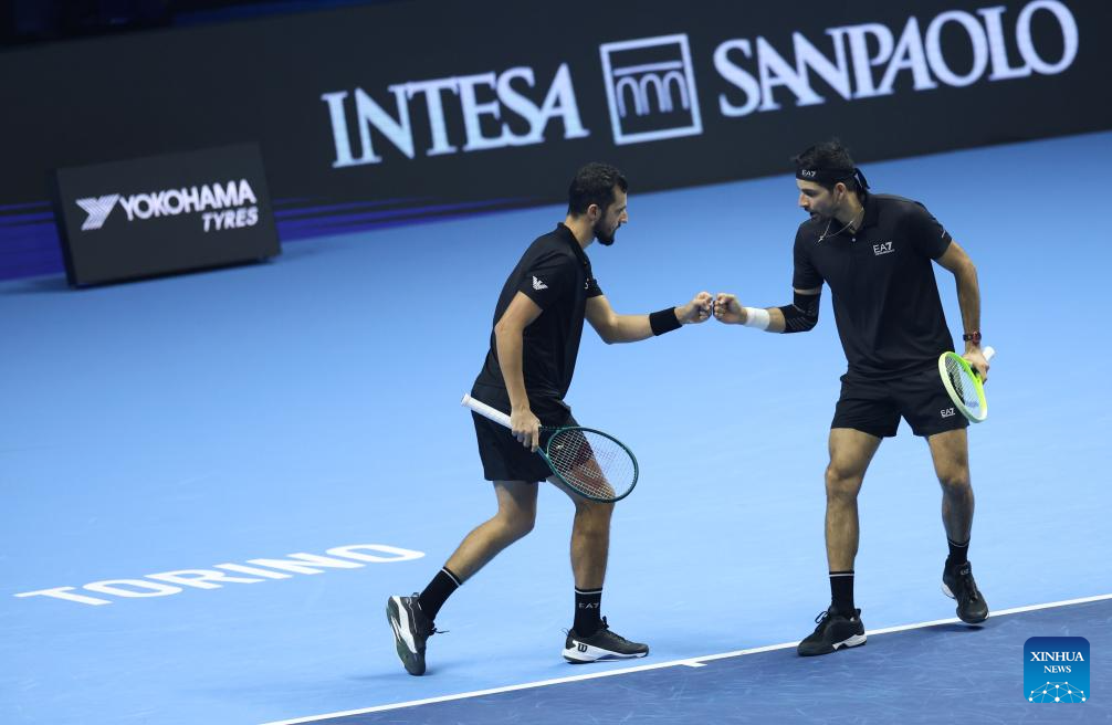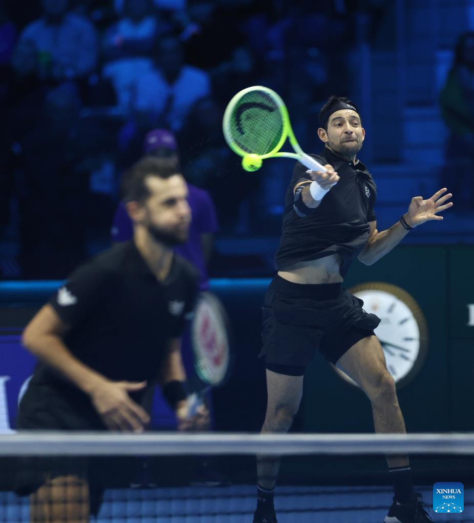 Marcelo Arevalo (R)/Mate Pavic compete during the men's doubles final match between Kevin Krawietz/Tim Puetz of Germany and Marcelo Arevalo(El Salvador)/Mate Pavic(Croatia) at the Nitto ATP Finals in Turin, Italy, on Nov. 17, 2024. (Xinhua/Li Jing)