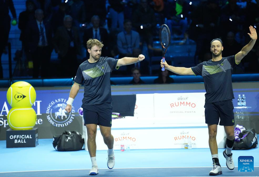 Kevin Krawietz(L)/Tim Puetz celebrate after winning the men's doubles final match between Kevin Krawietz/Tim Puetz of Germany and Marcelo Arevalo(El Salvador)/Mate Pavic(Croatia) at the Nitto ATP Finals in Turin, Italy, on Nov. 17, 2024. (Xinhua/Li Jing)