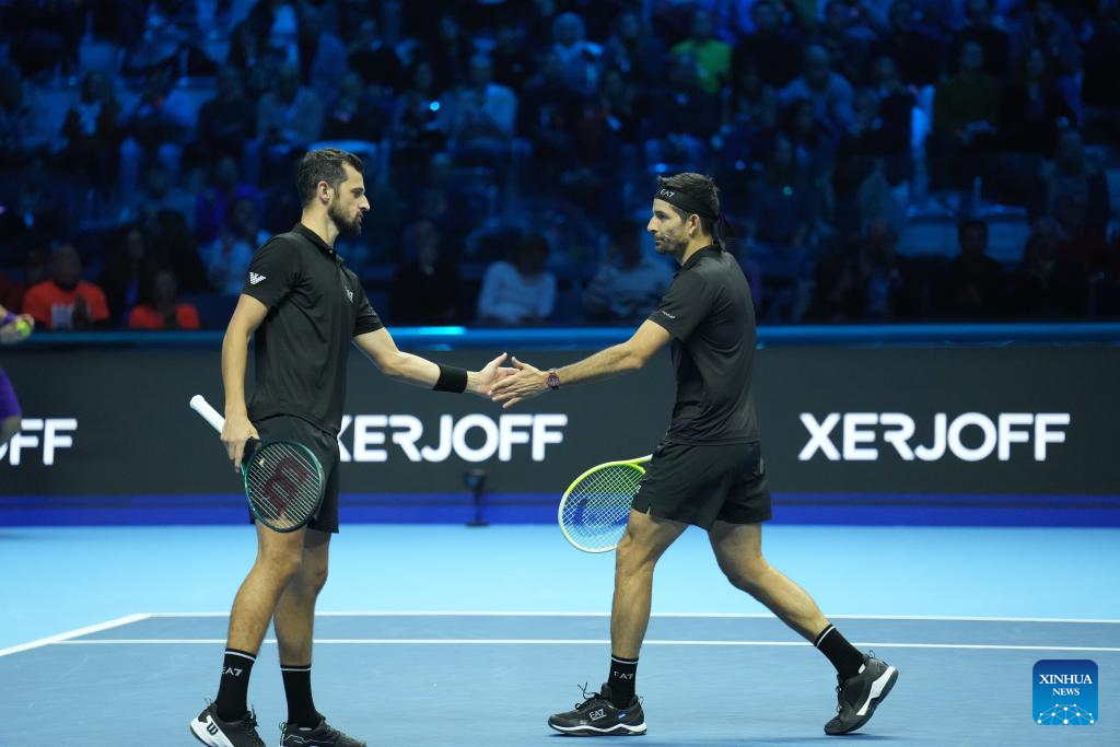 Kevin Krawietz/Tim Puetz (L) of Germany compete during the men's doubles final match between Kevin Krawietz/Tim Puetz of Germany and Marcelo Arevalo(El Salvador)/Mate Pavic(Croatia) at the Nitto ATP Finals in Turin, Italy, on Nov. 17, 2024. (Xinhua/Li Jing)