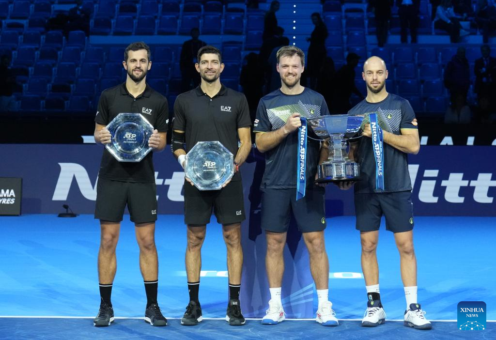 Winners Kevin Krawietz (2nd R)/Tim Puetz (1st R) and runners-up Marcelo Arevalo (2nd L)/Mate Pavic pose during the awarding ceremony after the men's doubles final match between Kevin Krawietz/Tim Puetz of Germany and Marcelo Arevalo(El Salvador)/Mate Pavic(Croatia) at the Nitto ATP Finals in Turin, Italy, on Nov. 17, 2024. (Xinhua/Li Jing)