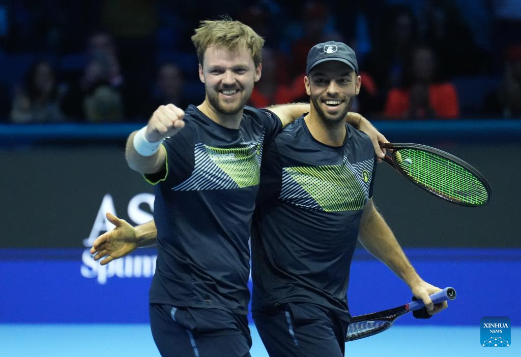 Kevin Krawietz (L)/Tim Puetz celebrate after winning the men's doubles final match between Kevin Krawietz/Tim Puetz of Germany and Marcelo Arevalo(El Salvador)/Mate Pavic(Croatia) at the Nitto ATP Finals in Turin, Italy, on Nov. 17, 2024. (Xinhua/Li Jing)